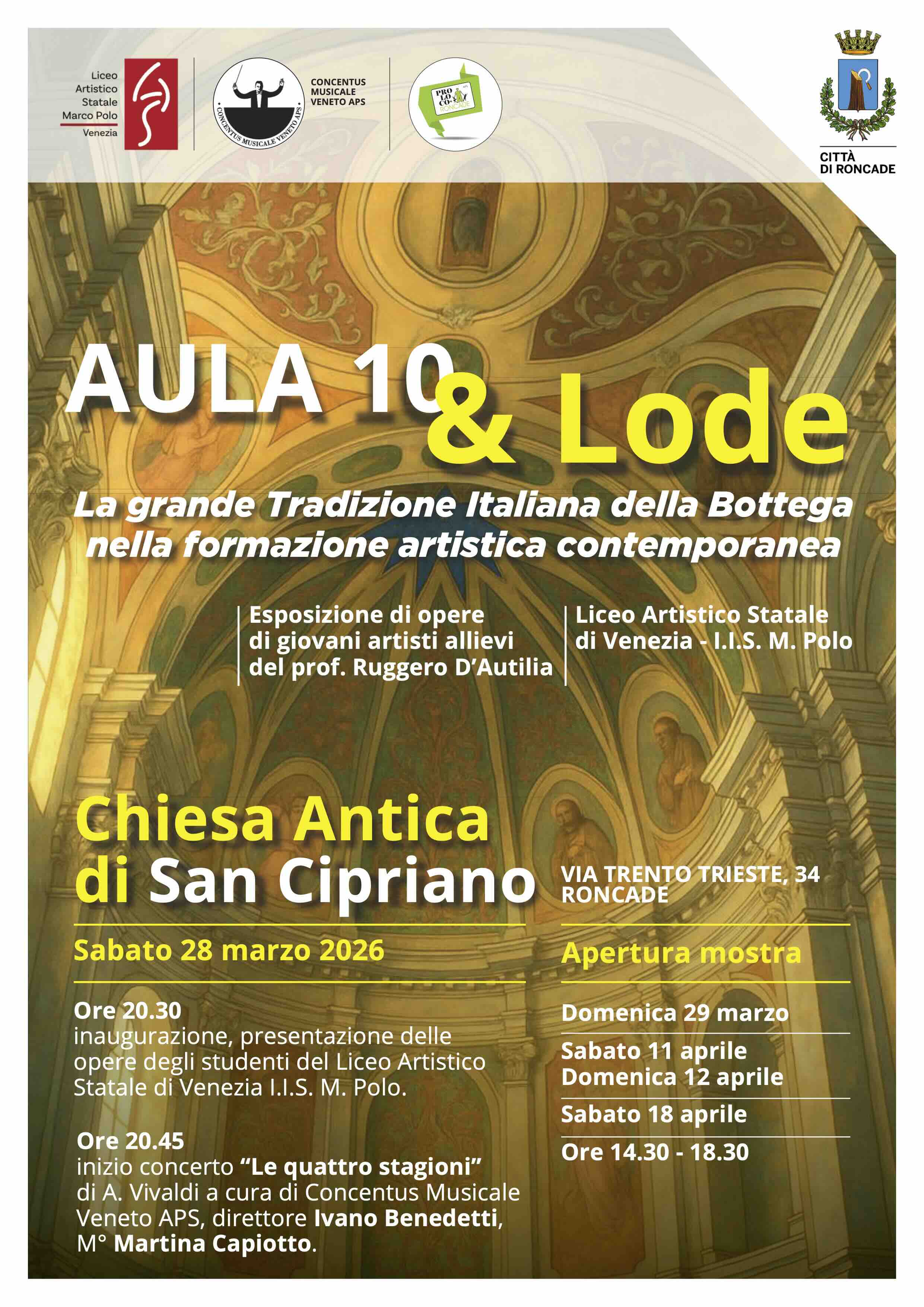 Si è aperta lo scorso 28 marzo, nella suggestiva cornice della Chiesa Antica di San Cipriano di Roncade, la mostra “Aula 10&Lode”, inaugurata dal concerto “Le Quattro Stagioni” di Antonio Vivaldi, eseguito dall’Associazione Concentus Musicale Veneto APS sotto la direzione dei Maestri Ivano Benedetti e Martina Capiotto, con primo violino il Maestro Carlos Garfias.