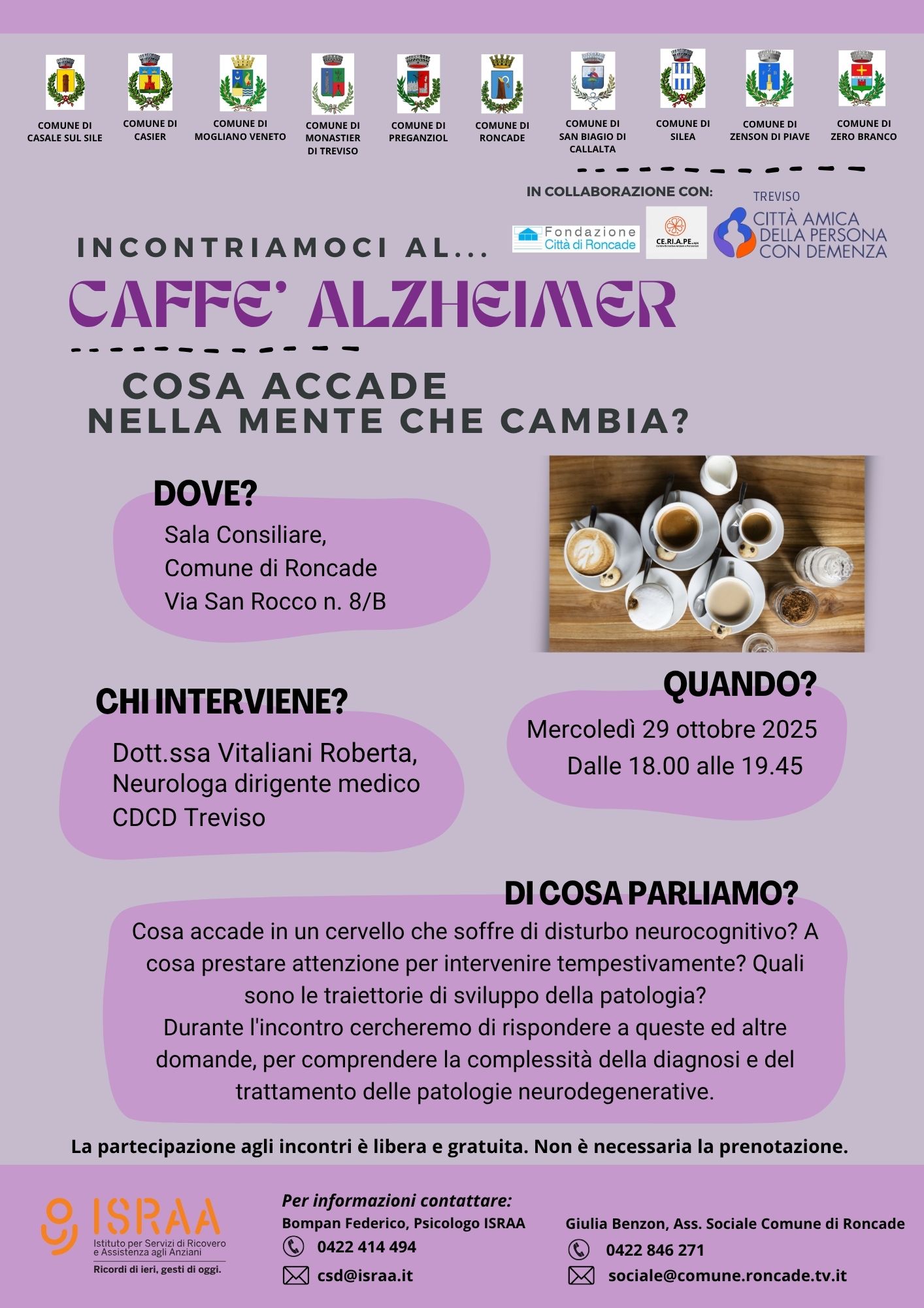 Cosa accade nella mente che cambia? Facciamo chiarezza nelle demenze? Roncade ospita un nuovo incontro di "Caffè Alzheimer" con la dott.ssa Vitaliani, neurologa CDCD ULSS2 Marca Trevigiana.