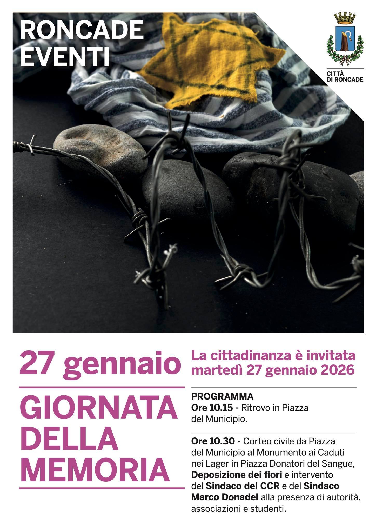 In occasione della Giornata della Memoria, ricorrenza internazionale del 27 gennaio dedicata al ricordo delle vittime dell’Olocausto, il Sindaco di Roncade invita la cittadinanza a partecipare alla cerimonia di commemorazione prevista.
