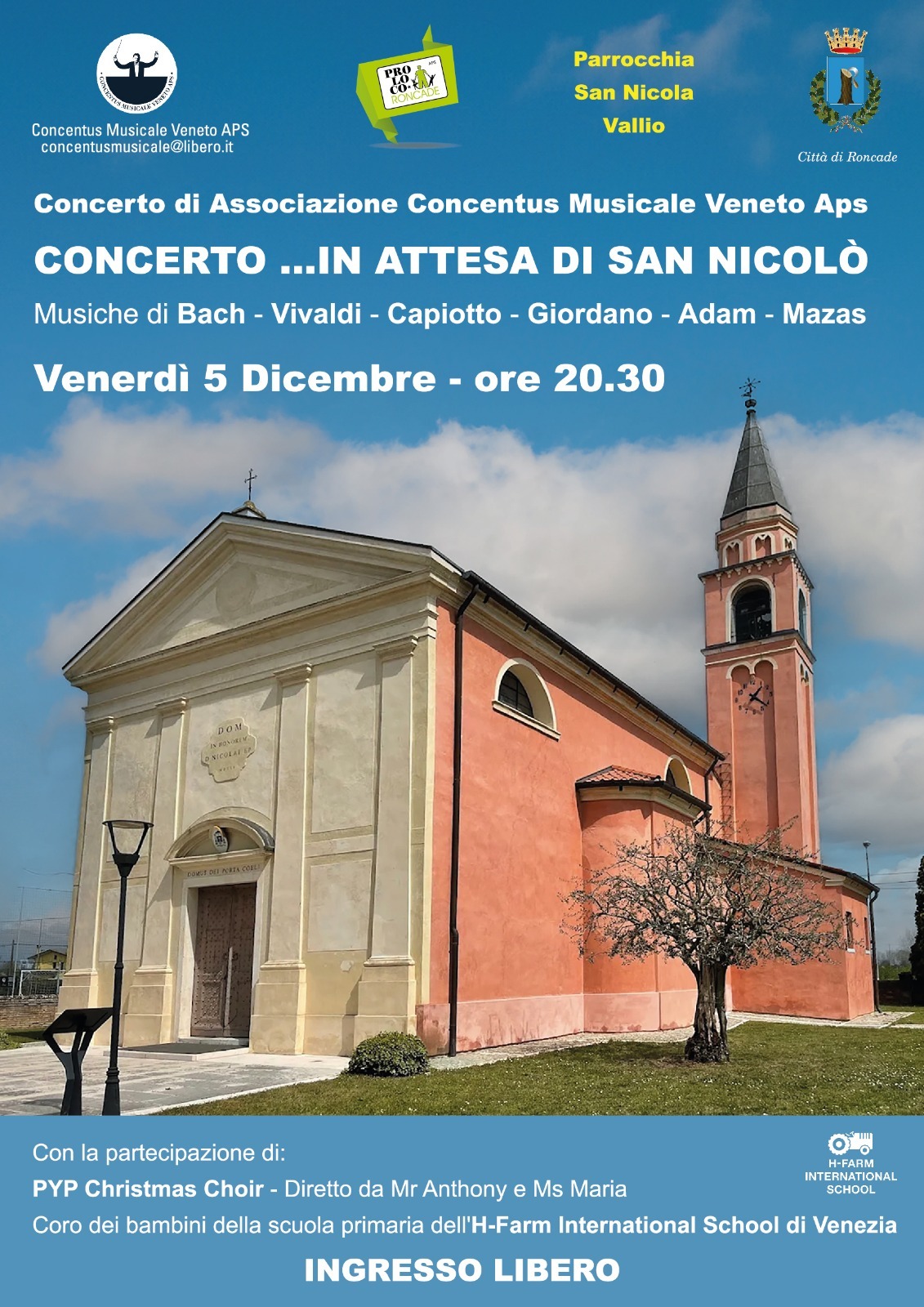 Ascolteremo Musiche di Bach, Vivaldi, Capiotto, Giordano, Adam e Mazas, oltre al coro dei bambini della scuola primaria H-Farm International School, diretto da Mr. Anthony e Ms. Maria.