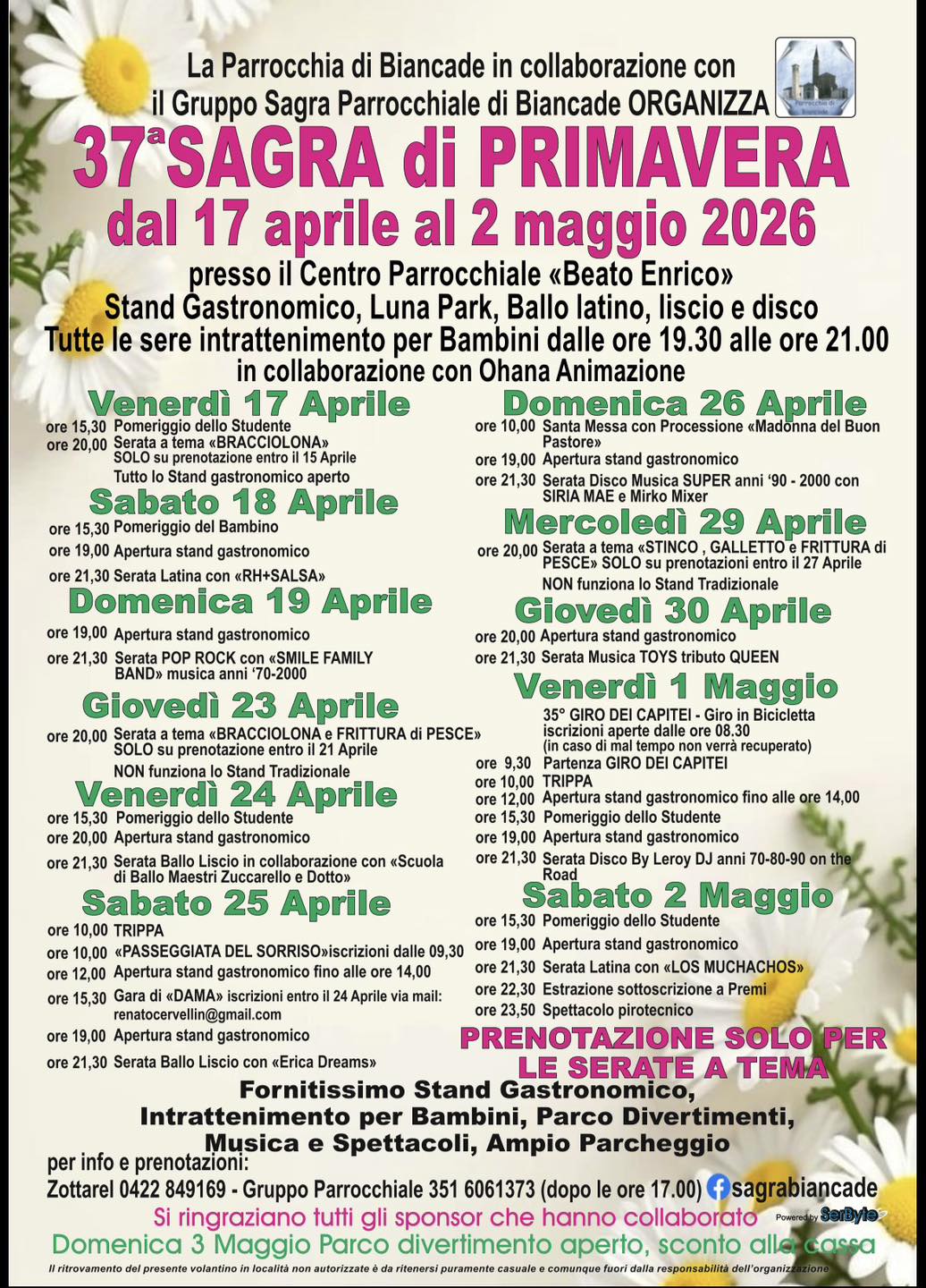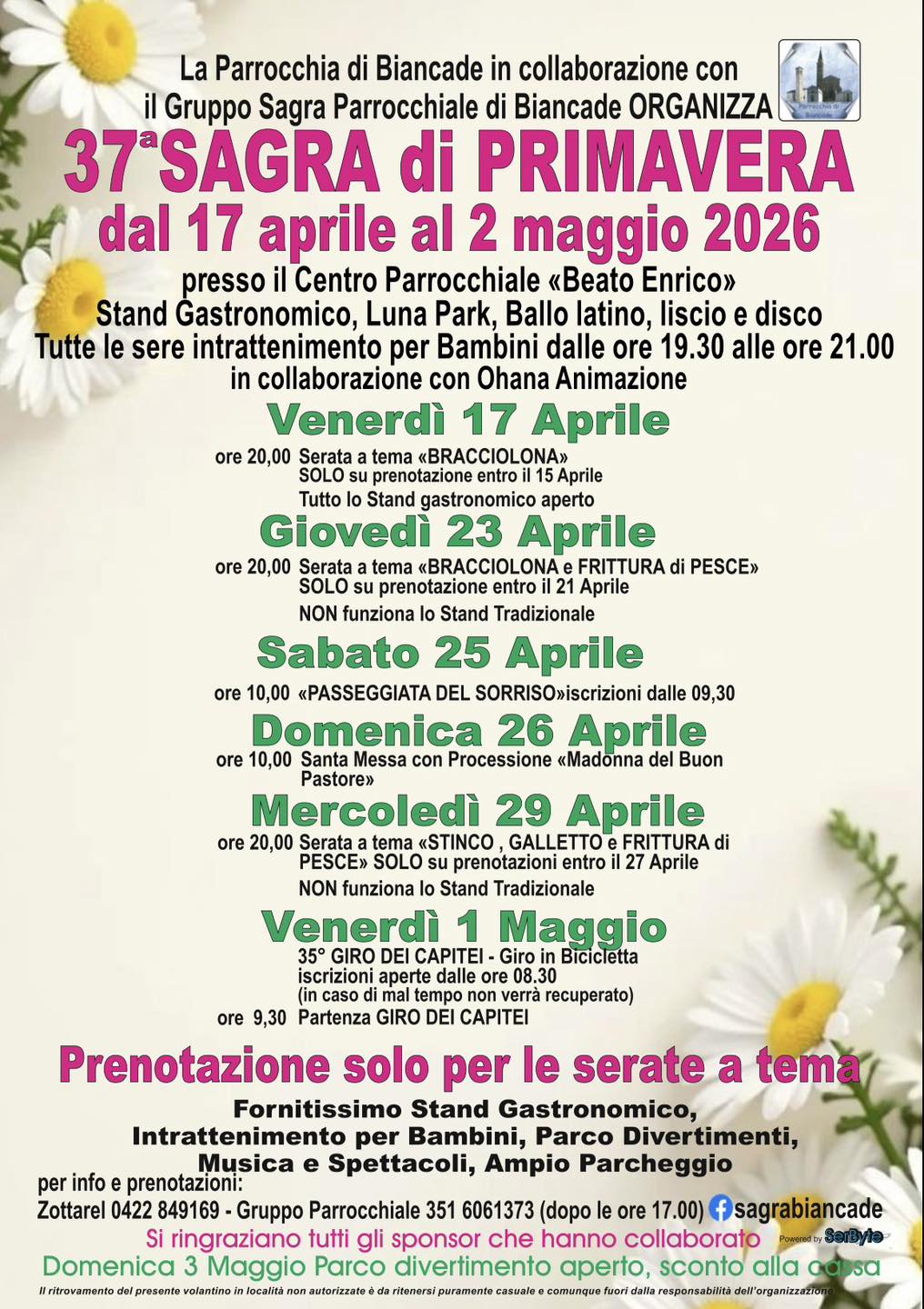 La Parrocchia di Biancade in collaborazione con il Gruppo Sagra Parrocchiale di Biancade organizza la 37ª edizione della Sagra di Primavera.
