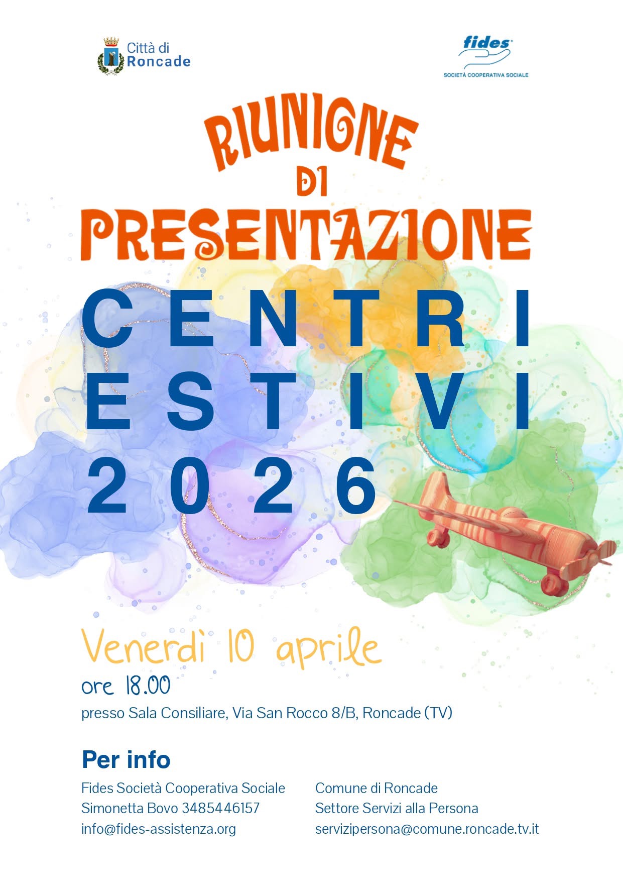 Venerdì 10 aprile è organizzata una riunione di presentazione dei centri estivi, alle ore 18:00 nella Sala Consiliare di Roncade, in via San Rocco 8/B.